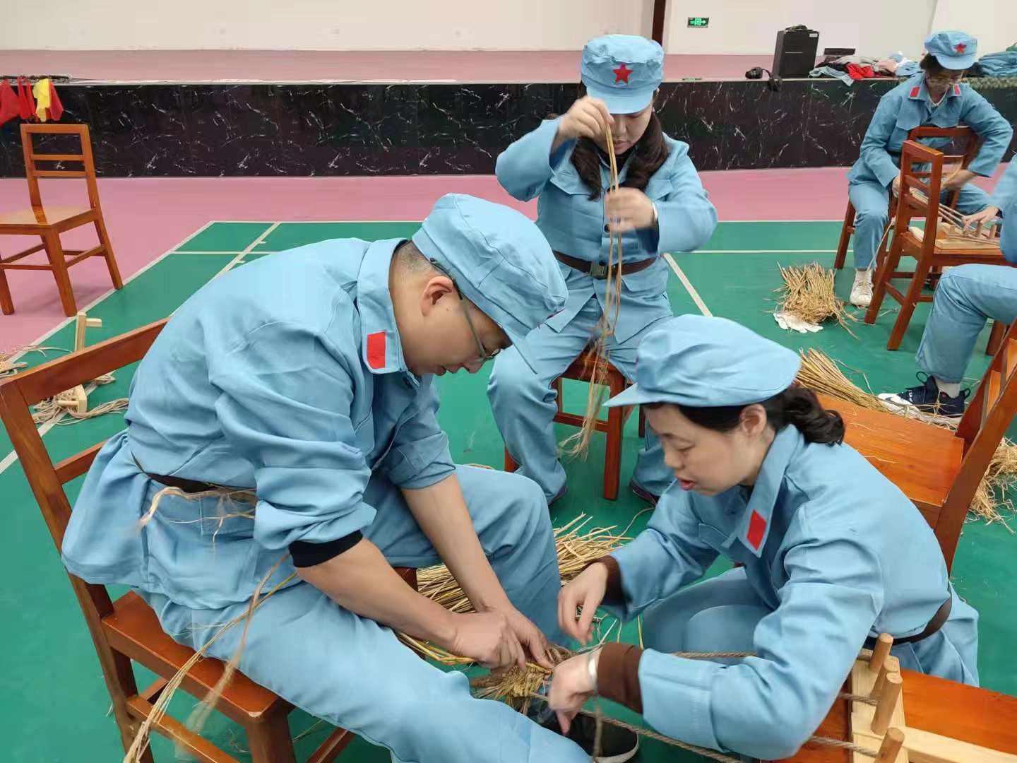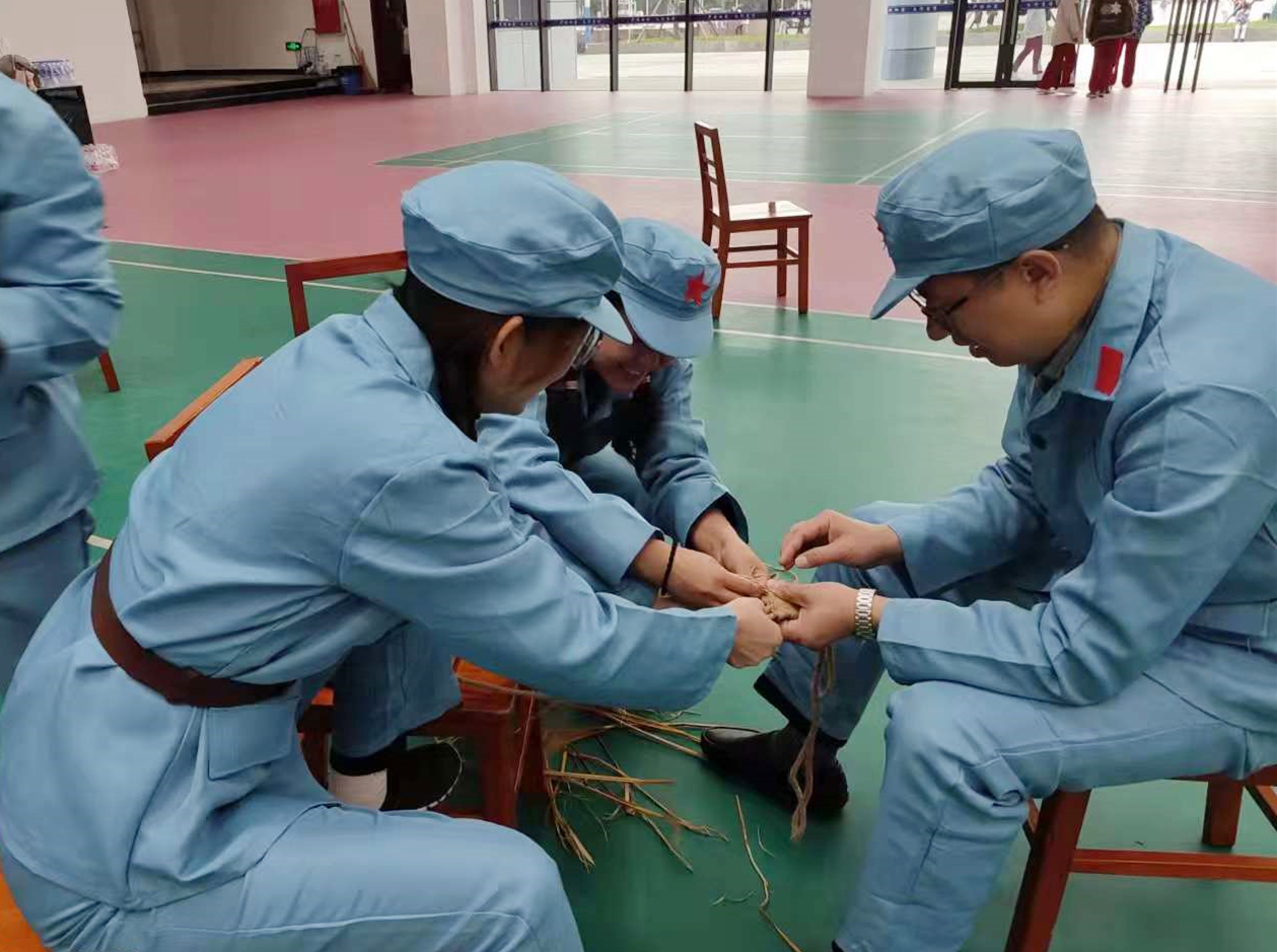 编制草鞋:在专业老师现场讲述“草编”技巧,并手把手教授后,全体党员纷纷动手实践搓草绳、编草鞋,一缠一绕间,展示匠人的智慧和坚守,身临其境感受红军当年的艰苦生活和革命乐观精神。‘脚穿草鞋跟党走,刀山火海不回头’,通过此次活动让大家走近长征,走近红军。深入了解红军长征的艰苦卓绝和坚持不懈、永不言败的长征精神。