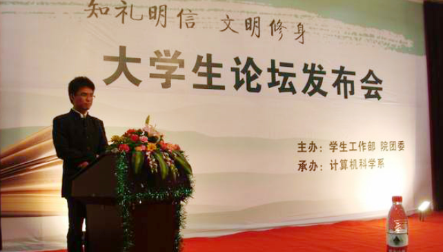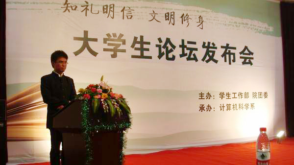 2011年5月25日晚,学院在广汉校区二阶教室召开大学生论坛发布会。此次发布会由学院计算机科学系承办,各系选送选手参赛。电子工程系经初赛选送了09级的陈久香和10级的王梁2名选手参赛。