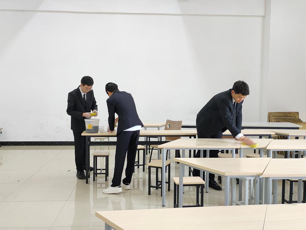 3月22日,学生党员们对电子工程系负责的文汇楼4楼和3楼共20间教室、致远楼7间教室进行了强化清洁,尤其重点清理了桌面,确保每一张桌面干净整洁。23日又对电子工程系负责的10个考场进行了清洁整理、标准化考场布置、调试桌凳等服务活动,确保每一间考场规范有序。