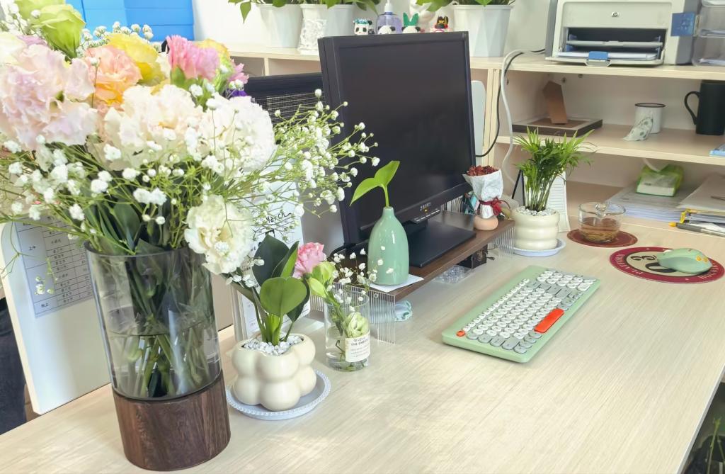 为营造舒适整洁的办公环境,增强部门职工团队精神和职业归属感,智能工程学院分工会于2025年3月组织开展了为期一个月的“爱岗位 敬劳动 致平凡”办公环境美化活动。分工会分批次为几个办公室购买了一批绿植、小盆栽和花瓶,用于老师们装扮自己的工位和美化办公环境。温馨整洁的工位,个性化舒适的工作小环境,能让老师们舒缓工作压力,感受生活的小美好,增强职业幸福感。