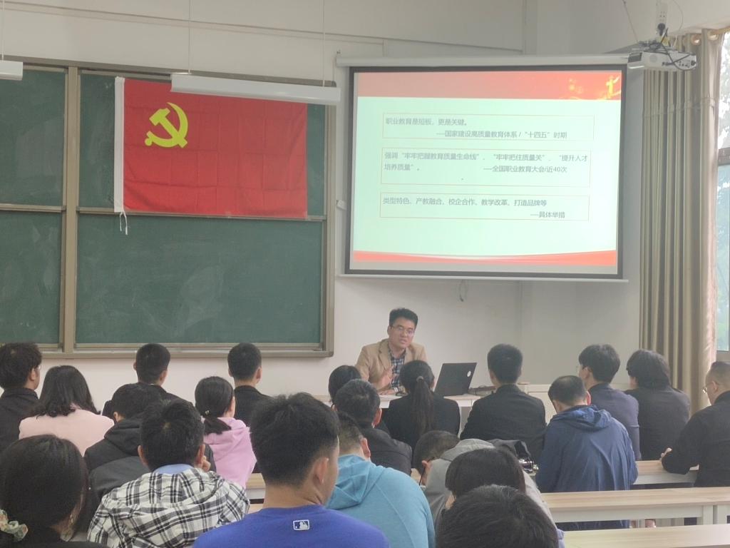 赵忠元此次主讲党课题目为《2022年职业教育总体思路和重点工作任务》。会上赵忠元详细讲述了本年度国家和四川省职业教育的重点任务,同时鼓励各位教师党员要抓住政策红利期,加强“双高”计划和职业本科专业的申报建设。