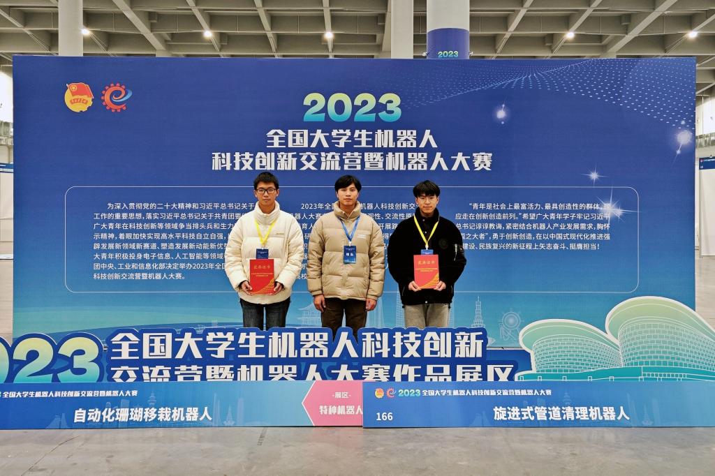 12月17日至19日,由共青团中央、工业和信息化部共同主办的2023年全国大学生机器人科技创新交流营暨机器人大赛决赛在山东省日照市举办。经过激烈的角逐,我校参赛团作品:《旋进式管道清理机器人》团队成员:袁永岚,《自动化珊瑚移栽机器人》团队成员:张兴华、谢金龙,《千载多功能水下作业机器人》团队成员:蒋佳晖,分别获得全国特等奖,全国二等奖,全国三等奖的荣誉,实现了本届全国机器人大赛的“大满贯”。此次比赛我校也是唯一获得特等奖的四川省高职院校。