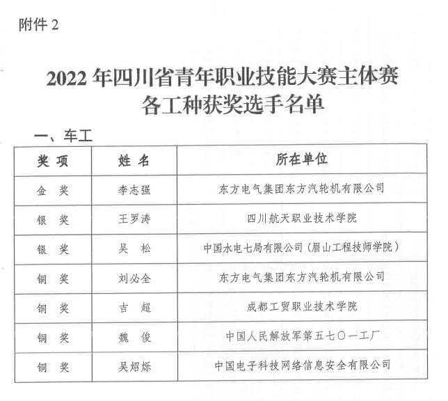 日前,由共青团四川省委、四川省人力资源和社会保障厅下发川青联发〔2022〕40号文件“关于表扬2022年四川省青年职业技能大赛获奖选手和优秀组织单位的通报”我校实训教学部王罗涛、蒋应平两位老师,分别荣获车工赛项银奖(全省第二名)、铣工赛项铜奖(全省第五名)。