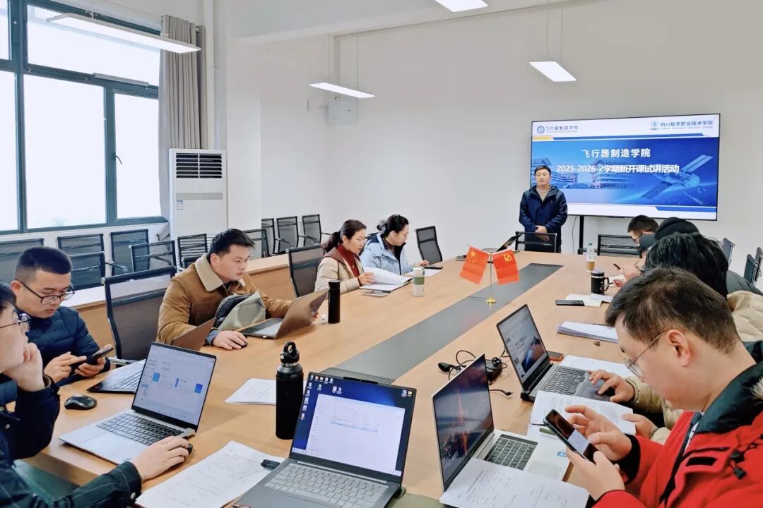 为深化教学改革、保障教学质量,进一步加强师资队伍建设,严把课堂教学准入关。1月16日上午,飞行器制造学院在三星堆校区知行楼E322会议室,顺利组织召开了2025-2026学年第二学期新开课程试讲评审会。本次试讲评审工作学院高度重视、精心组织,评审小组成员包括飞行器制造学院副院长吴玉超,以及各专业负责人李文兵、董小磊、刘涛、张卓娅、王琪。