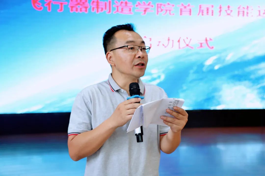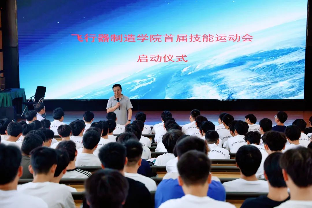 随后,学校副校长周林致开幕辞。周林副校长对飞行器制造学院首届技能运动会的举办表示热烈祝贺,并指出技能竞赛是检验教学成果、展现学生风采的重要平台。他勉励全体参赛选手以赛促学、以赛促练,赛出水平、赛出风格,同时要求裁判员和工作人员严守规则、公正执裁,确保赛事安全有序进行。