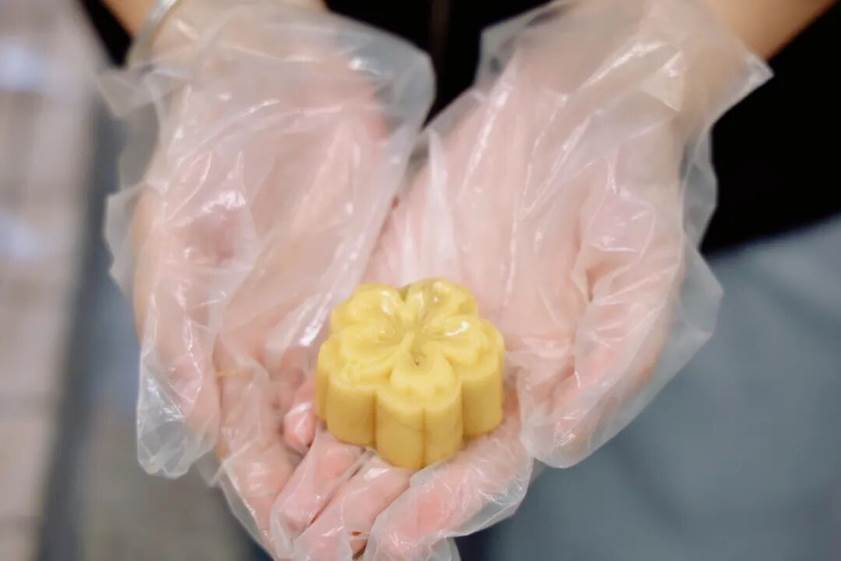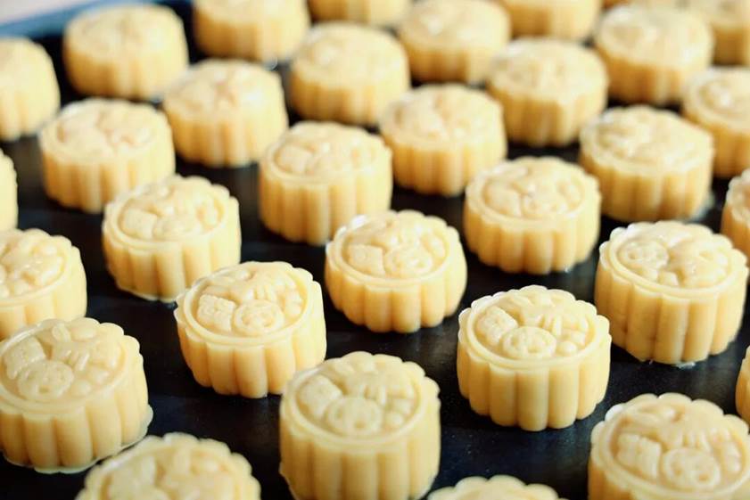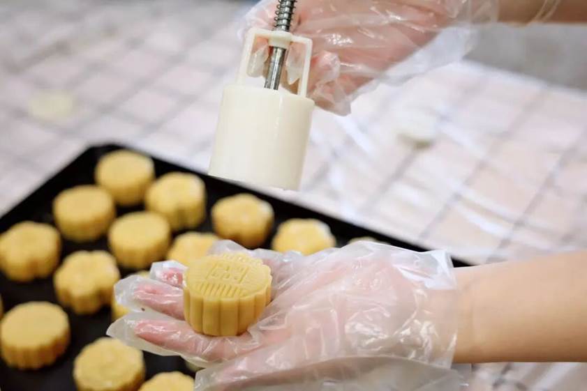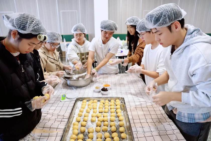 活动当天,天和美食城三楼欢声笑语,香气弥漫。同学们兴致勃勃地投入到月饼制作中。从和面、制皮到称重、包馅,再到压模、成型,每一个步骤都凝聚着大家的专注与热情。当一枚枚印有精美图案的月饼胚在巧手下诞生时,同学们的脸上洋溢着自豪与期待。本次活动的月饼馅料准备了经典的蛋黄莲蓉与蛋黄豆沙两种口味,咸甜交织,风味传统,深受同学们喜爱。