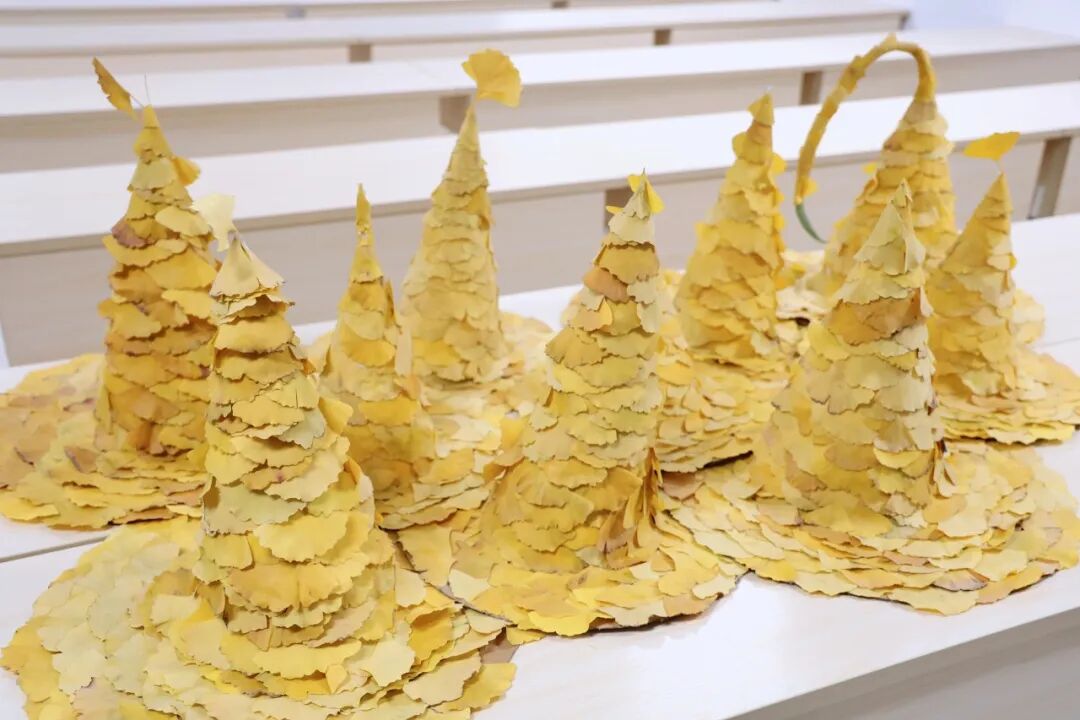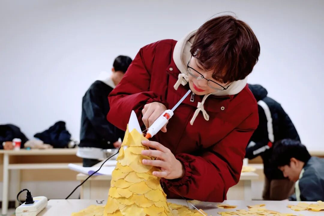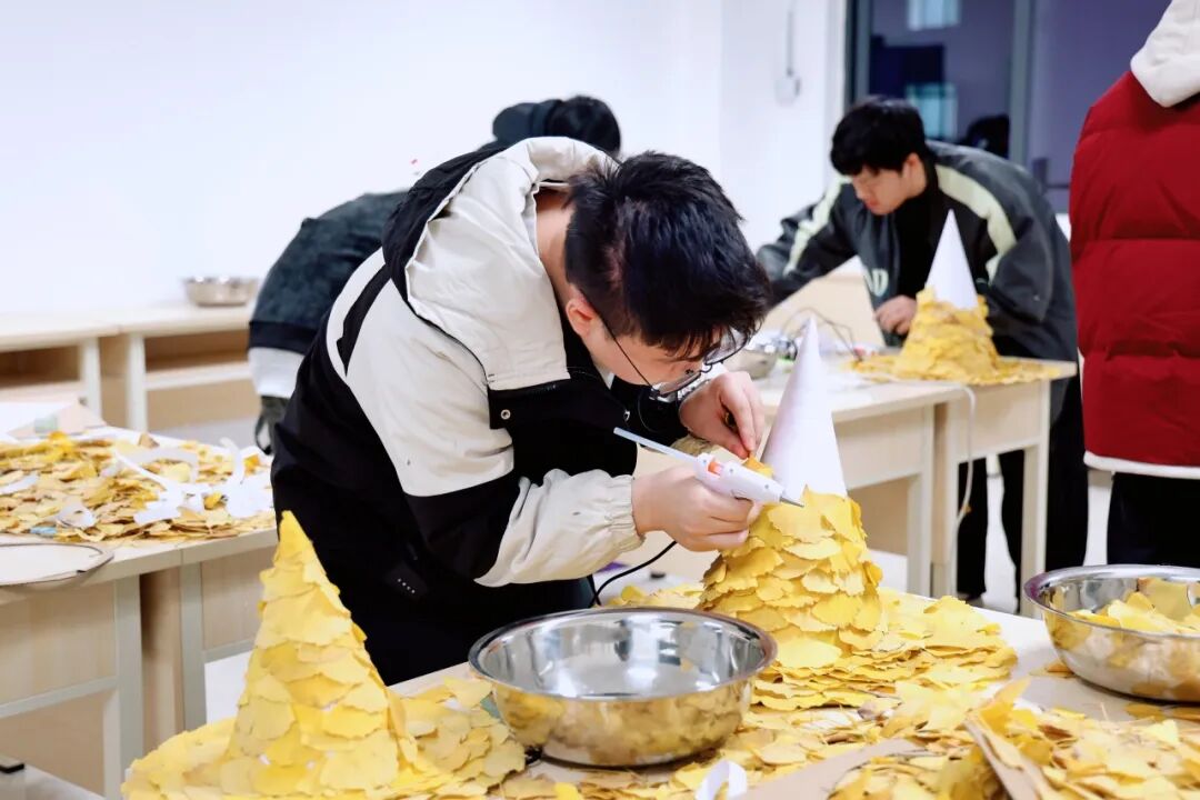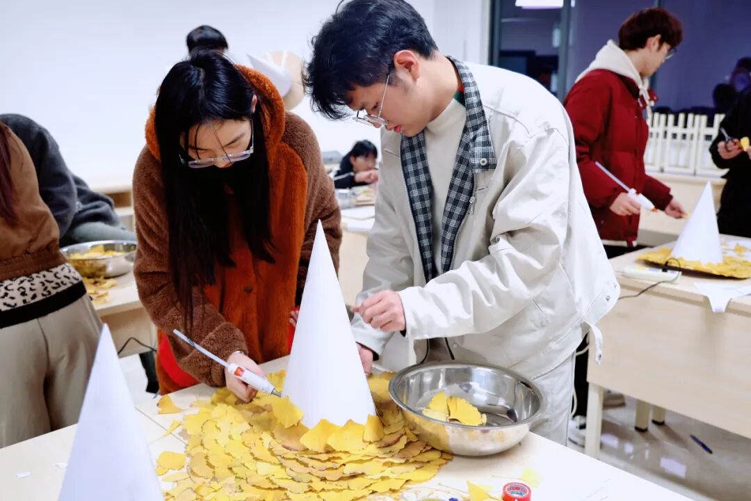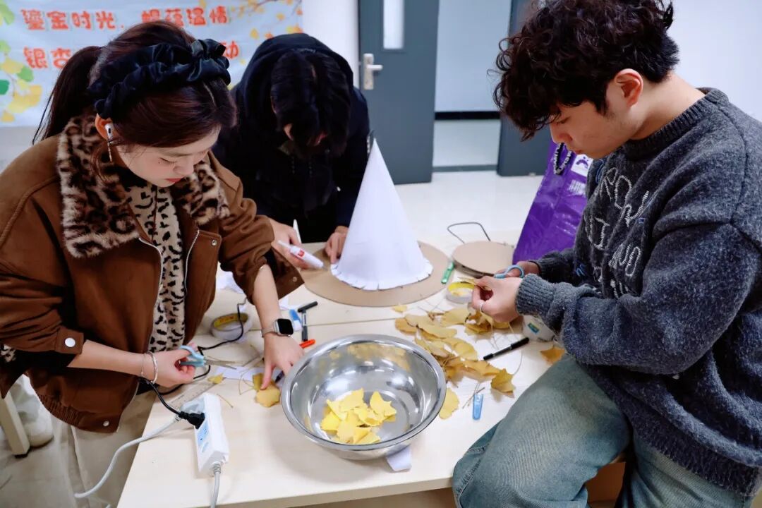 本次活动巧妙结合时节特征与创意美育,鼓励同学们走出宿舍,在校园中收集自然馈赠—金黄的银杏叶,作为核心创作材料。活动现场气氛温馨,在两位学生导师的悉心指导下,参与者们充分发挥想象力与创造力,通过修剪、拼贴、固定、装饰等步骤,将一片片形态各异的银杏叶精心组合、重塑。原本平凡无奇的落叶,在同学们灵巧的双手中,逐渐被赋予新的形态与生命,演变为一顶顶独一无二、闪耀着温暖光泽的“金色魔法帽”。每一顶帽子都承载着制作者独特的巧思,也凝固了属于这个初冬的校园金色回忆。