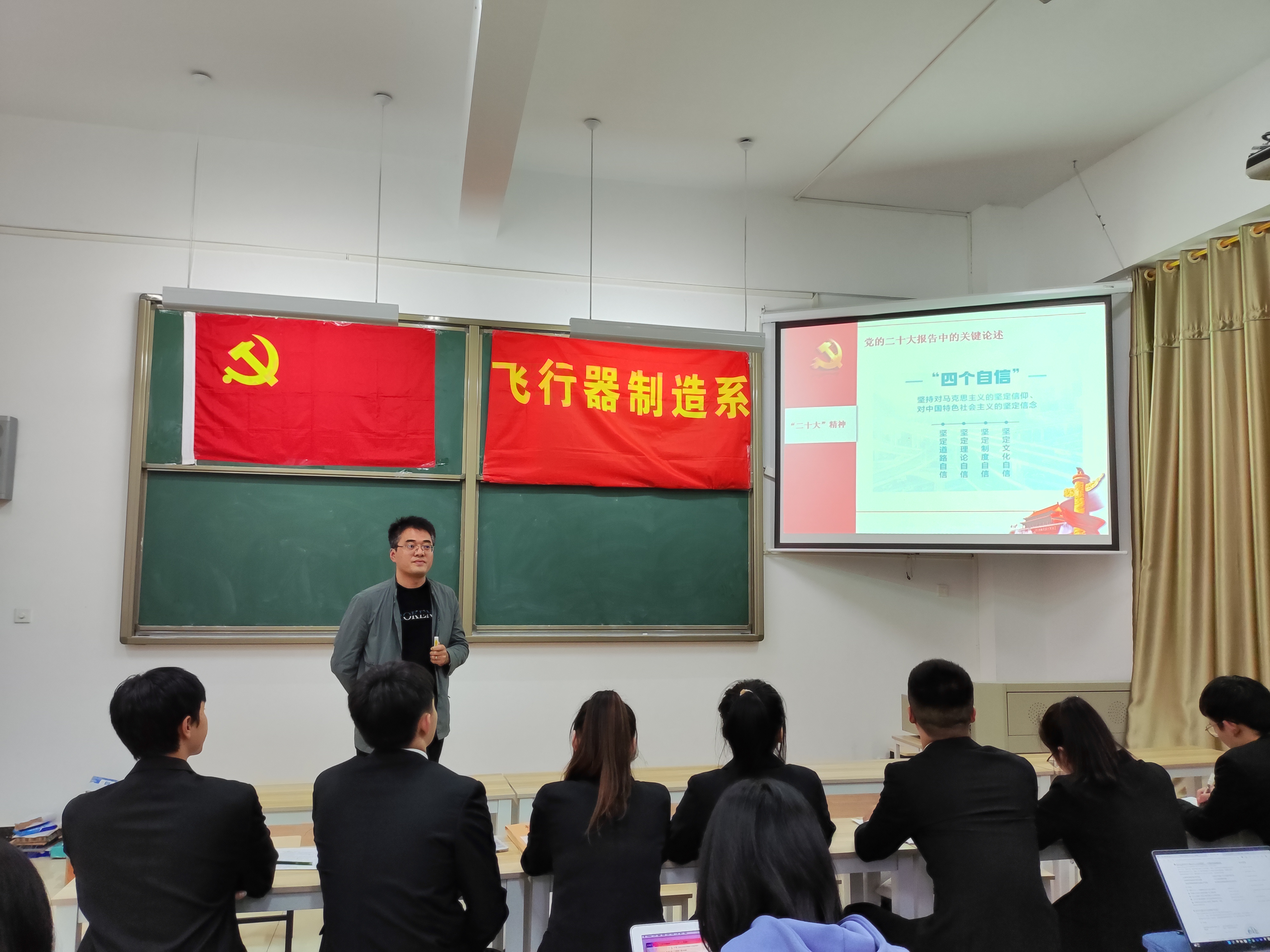会上首先讨论了9名预备党员转正的事宜,经全体党员投票表决,9名预备党员都按期转正。随后,飞行器制造系党支部书记赵忠元以“学习二十大精神,永远跟党走,奋斗新征程”为题分享交流了主题党课。