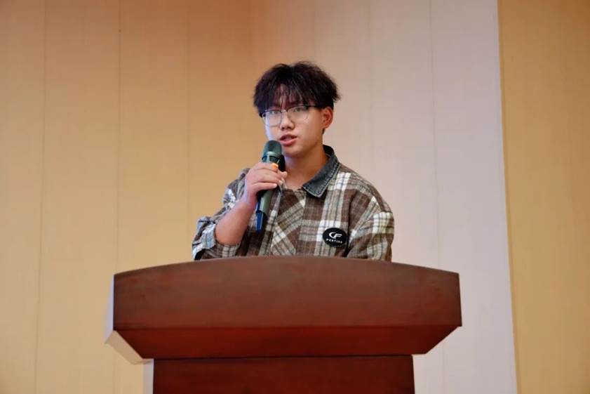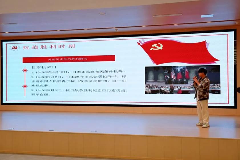活动围绕“抗战胜利回顾”“英雄事迹展示”“精神传承案例”与“薪火相传实践”四个篇章层层展开。唐东同学以时间轴形式系统梳理了从“九一八”事变到日本投降期间的重大历史事件,结合珍贵影像与详实数据,生动再现了中华民族艰苦卓绝的抗战历程。在英雄事迹环节,通过沉浸式短片与历史档案,杨靖宇、刘湘等革命先烈的感人事迹深深触动了在场同学,引发强烈共鸣。在精神传承部分,唐东同学从个人、社会和国家三个层面系统阐释了传承英烈精神的实践路径。他强调,青年一代应从自身做起,将英雄精神融入日常学习与生活;社会应共同营造崇尚英雄、弘扬正气的良好氛围;国家则通过制度保障与政策支持,为精神传承筑牢根基。
