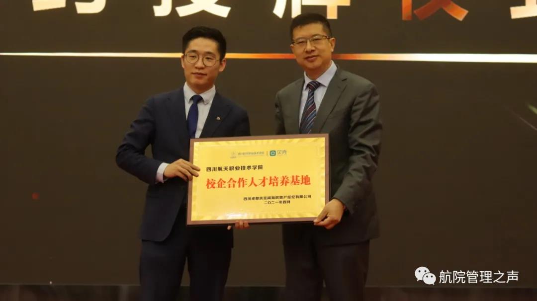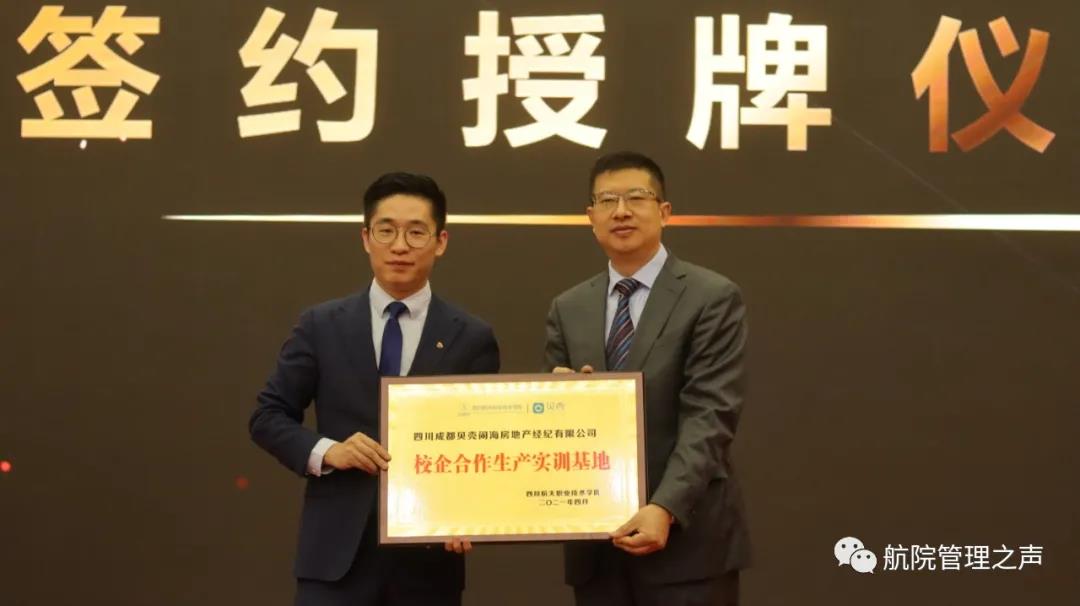 学院副院长陈宇为企业授“校企合作生产实训基地”牌匾,成都贝壳闹海房地产公司蓉北事业部总监赵佳为学院授“校企合作人才培养基地”牌匾。