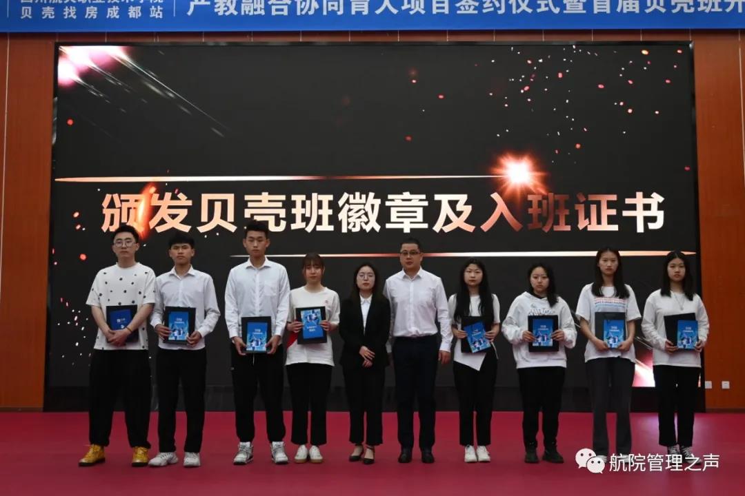 由贝壳闹海房地产公司代表 冯超、秦佳宝、 黄超、袁园、毛黎萍,学院代表吴旭、李建群、郑敏、张欢、杜俊鹏为贝壳班同学颁发徽章、入班证书及伴手礼。