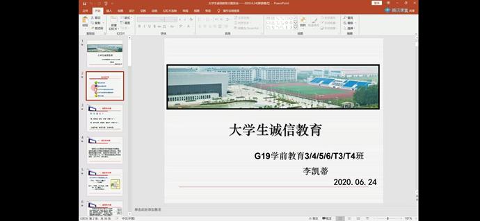 2020年6月24日管理工程系学前教育专业举行了关于诚信教育这一方面的主题班会活动,因疫情原因此活动在线上举行;主讲人李凯蒂老师,学前教育专业学生集体参会。: b) W" }6 W/ ]# `. H