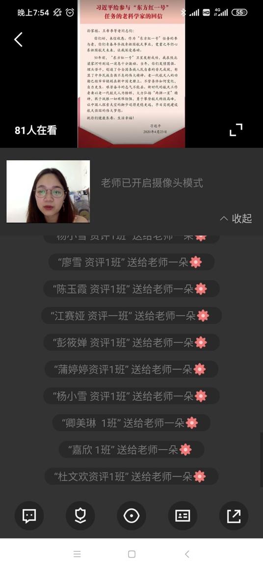 2020年6月7日,我班在腾讯课堂上开了主题为《习近平总书记给参与“东方红1号”任务的老科学家回信》的班会,全班84名同学参加。" u9 G; R% B5 R