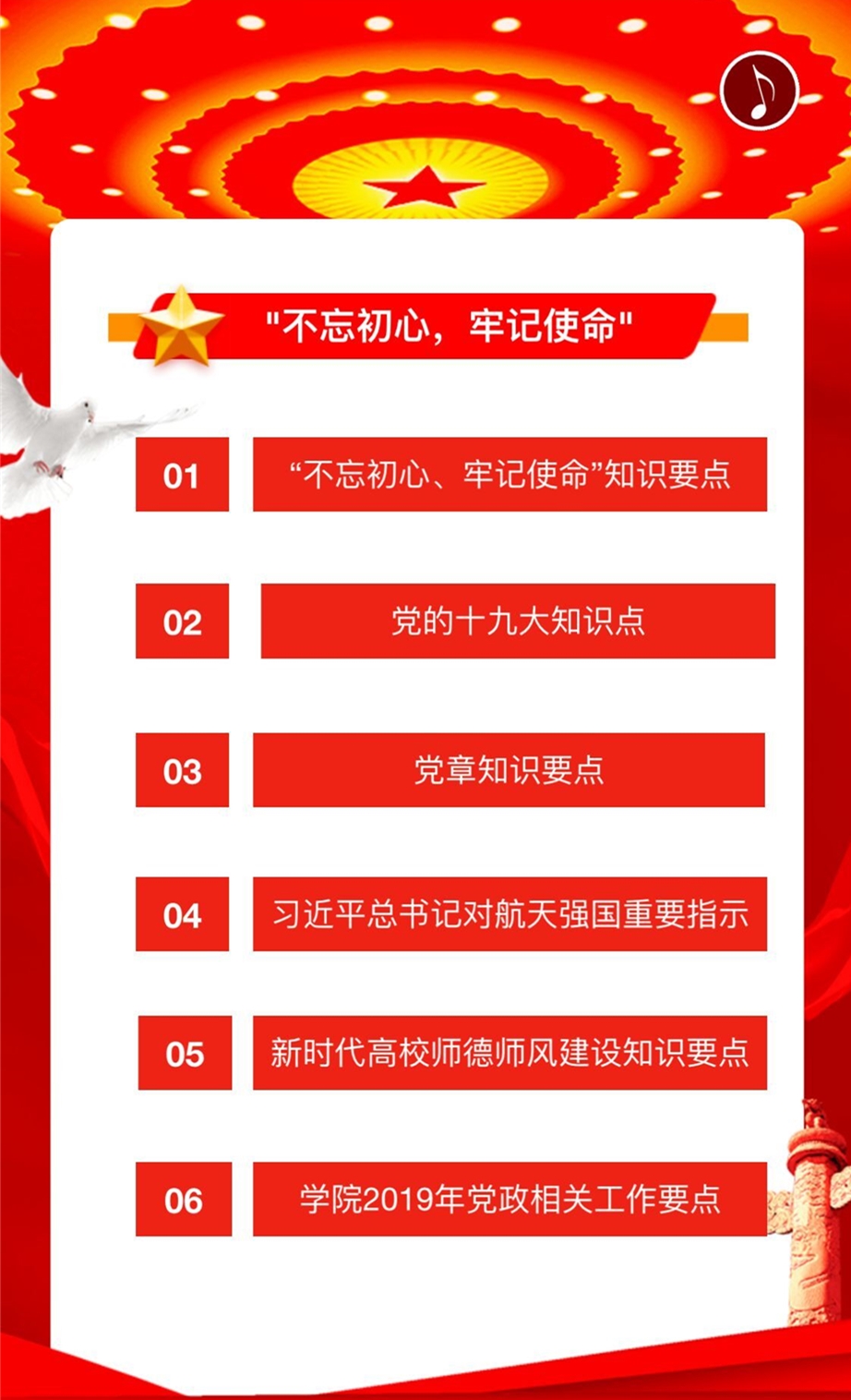 小程序包括“不忘初心、牢记使命”知识要点、党的十九大知识点、党章知识要点、习近平总书记对航天强国重要指示、新时代高校师德师风建设知识要点、学院2019年党政相关工作要点等100问,图文结合,内容全面。最后还设有党员学习心得交流,可以让党员们积极分享、畅所欲言。这个小程序由机关四党员工用H5软件自制,有制作简便,成本低廉的特点。