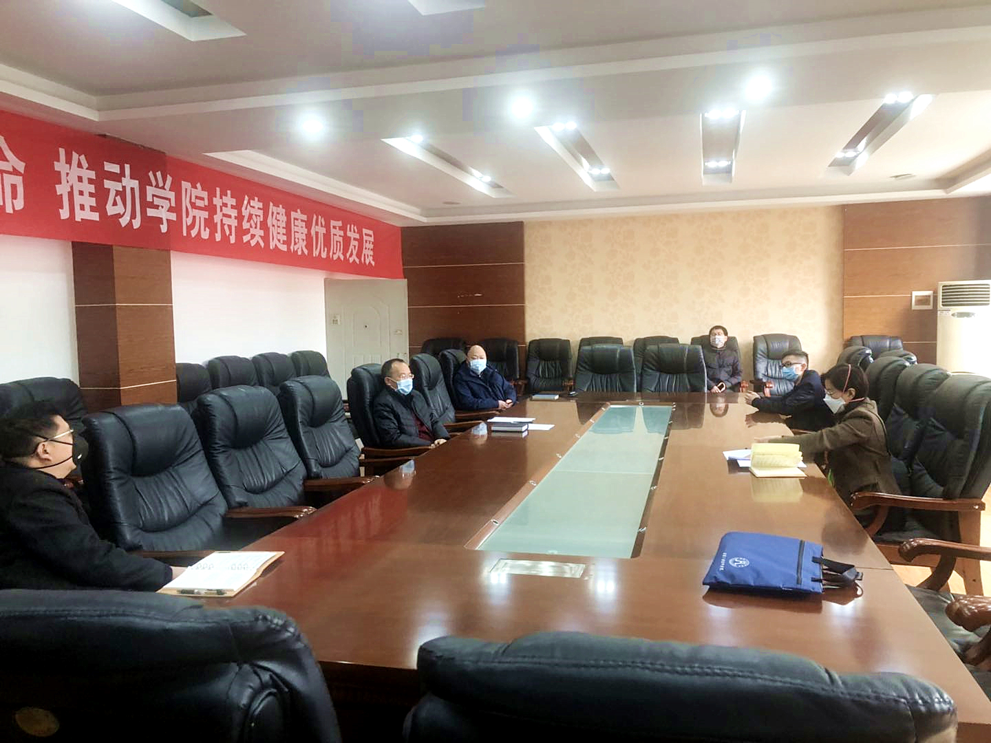 2020年3月6日,成都市人社局职建处副处长刘江、教研室副主任彭杰和教研室汪萍到学院龙泉校区检查指导新冠肺炎疫情防控和开学准备工作开展情况,学院院长刘家騑,副院长陈宇、李晓敏热情接待了督导组一行。