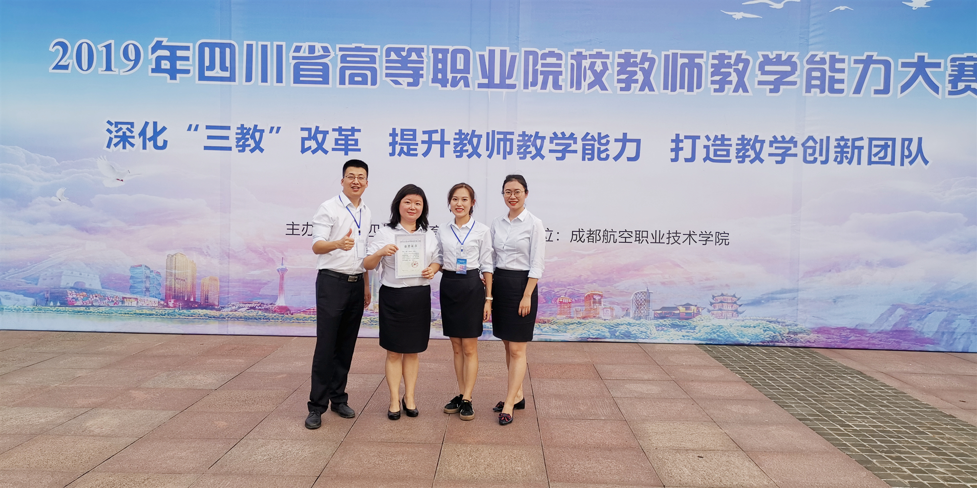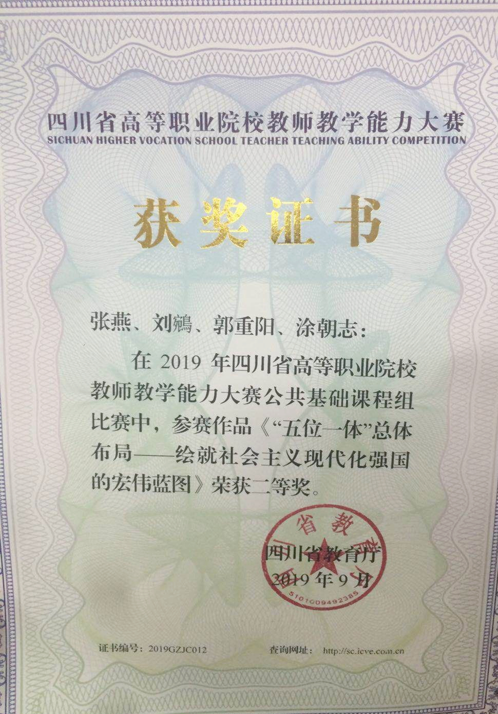 9月8日,2019年四川省高等职业院校教师教学能力大赛在成都航空职业技术学院落下帷幕,十大网投平台排名选送的张燕、刘鵷、涂朝志、郭重阳教师团队的《“五位一体”总体布局——绘就社会主义现代化强国的宏伟蓝图》荣获二等奖。