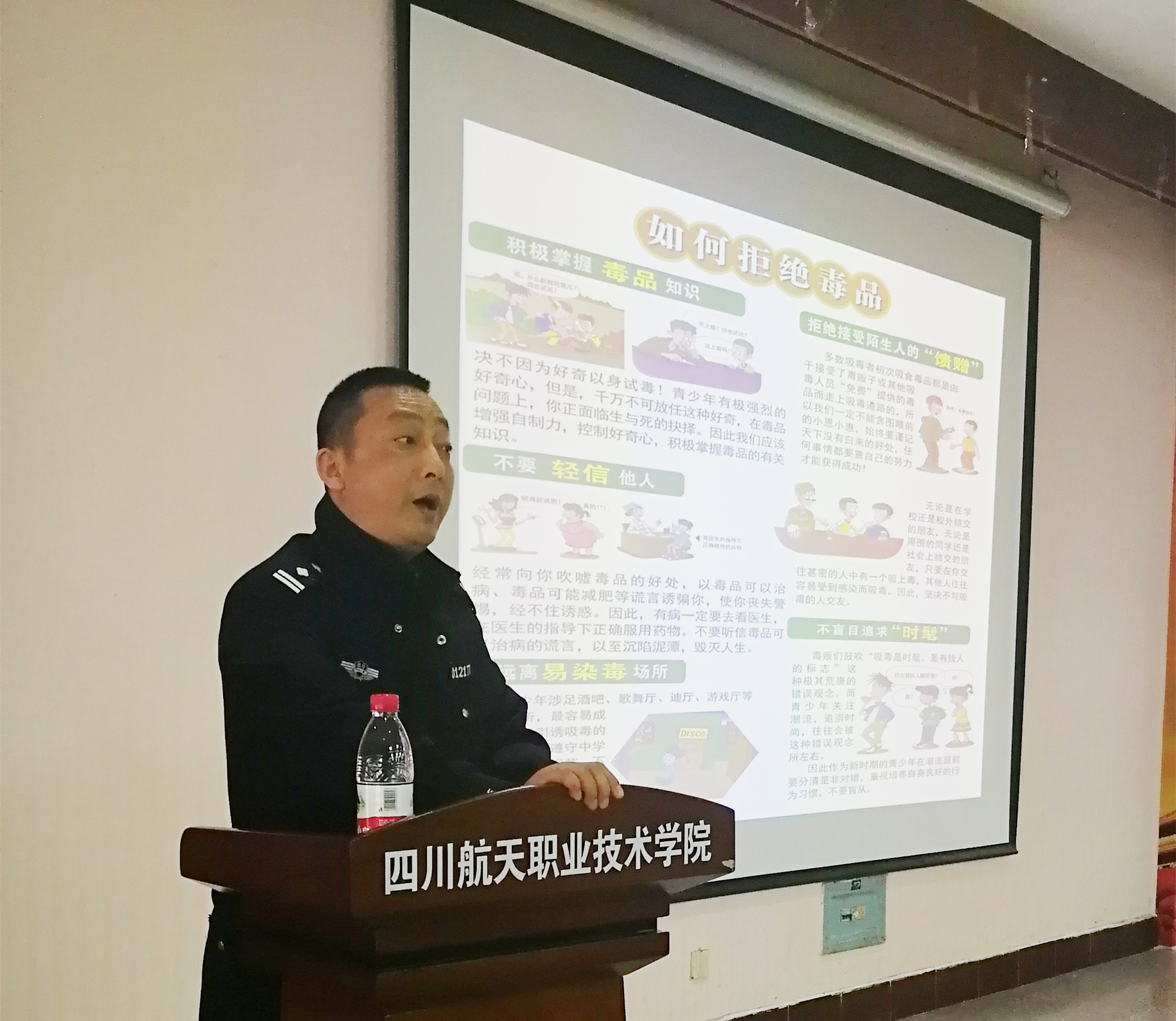 为加强学院禁毒安全管理工作,进一步提升全院师生防毒拒毒能力,4月16日,应学院保卫处邀请,龙泉公安分局北干道派出所张健警官在南教学楼阶梯教室,开展了一堂以“珍爱生命 远离毒品”为主题的禁毒安全专题教育课,学院300多名师生接受了禁毒安全教育。