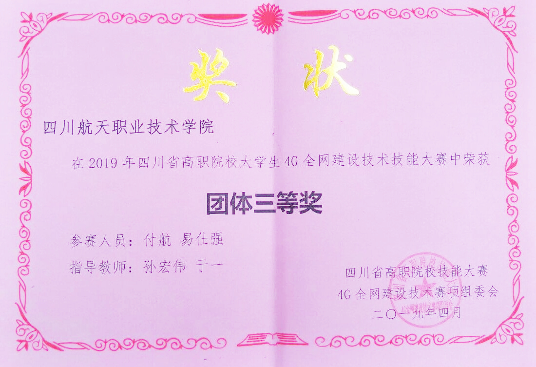 2019年4月3日,由省教育厅主办,四川邮电职业技术学院承办的四川省高职院校大学生4G全网建设技术技能大赛落下帷幕。参加此次比赛的有四川邮电职业技术学院、四川交通职业技术学院、四川信息职业技术学院、绵阳职业技术学院、乐山职业技术学院、南充职业技术学院等10所高职院校,19支代表队。我校是唯一以一个代表队参赛的院校,经过150分钟的理论考试、4G网络配置与优化、4G网络故障排除,电子工程系的付航和易仕强同学最后获得了四川省三等奖的荣誉。