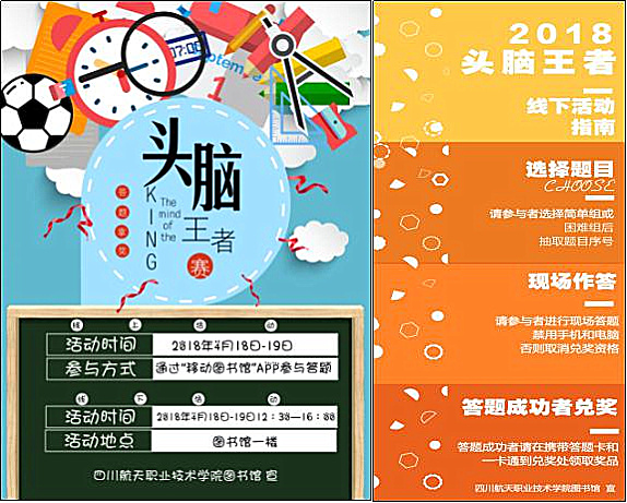 “航院版头脑王者”围绕弘扬民族文化、引导广大读者阅读经典好书的宗旨,采用线上线上并行有奖答题的形式,有效提高数字资源和实体资源利用率。