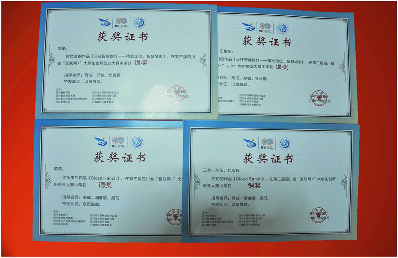 学院陈宇副院长带领科研处王立波处长、王银老师携获奖团队指导教师和获奖学生参加了颁奖典礼,管理工程系高成老师指导的2个参赛项目获得奖项,其中G15市场班刘豪、王俊东《天柱智能路灯—精准定位、智慧城市》项目获创意组银奖,G16市场班黄燕、陈阳、王林、代宏程《CLOUD RANCH》项目创意组铜奖。