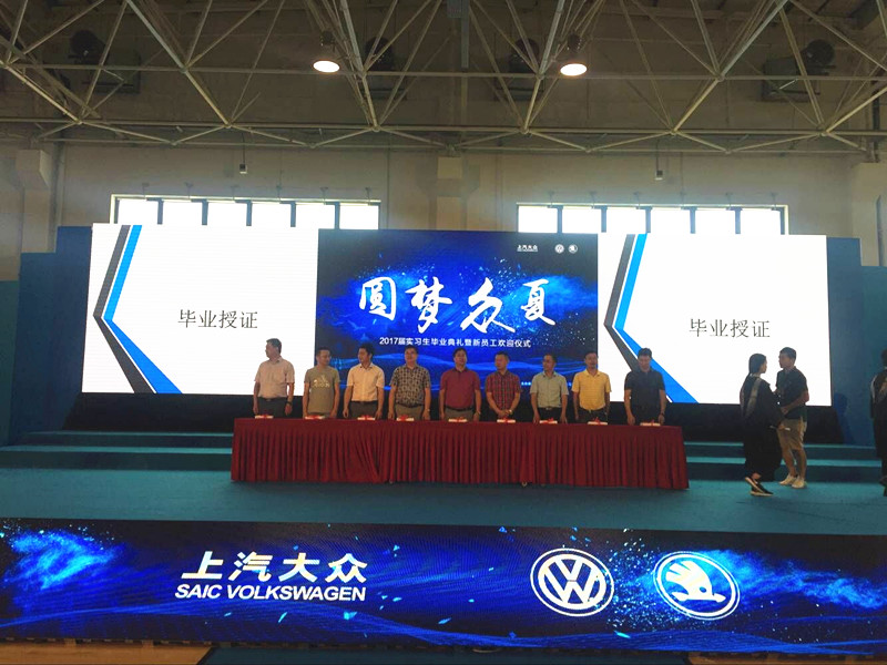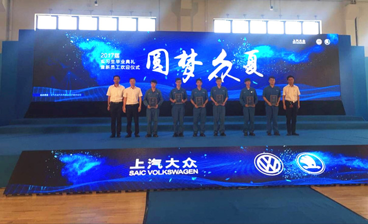 7月27日,上汽大众汽车有限公司宁波分公司举行了“2017届实习生毕业典礼暨新员工欢迎仪式”。十大网投平台排名副院长陈宇、就业处处长古中林、教务处处长王德佩一行5人、上汽大众汽车有限公司宁波分公司厂长张荃、党委书记黄解元、行政管理高级经理张宏成及与上汽大众开展校企合作的全国14所高职院校代表参加了本次活动。