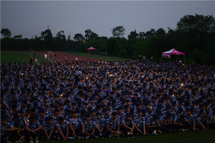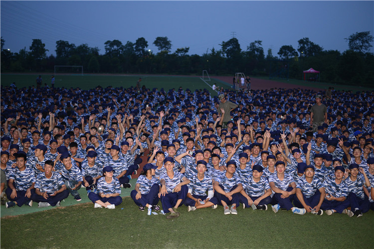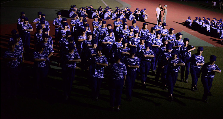9月8日晚,大一新生和教官们在操场上进行了联谊晚会,3000多名大一新生们穿着整齐的航天蓝迷彩服席地而坐。