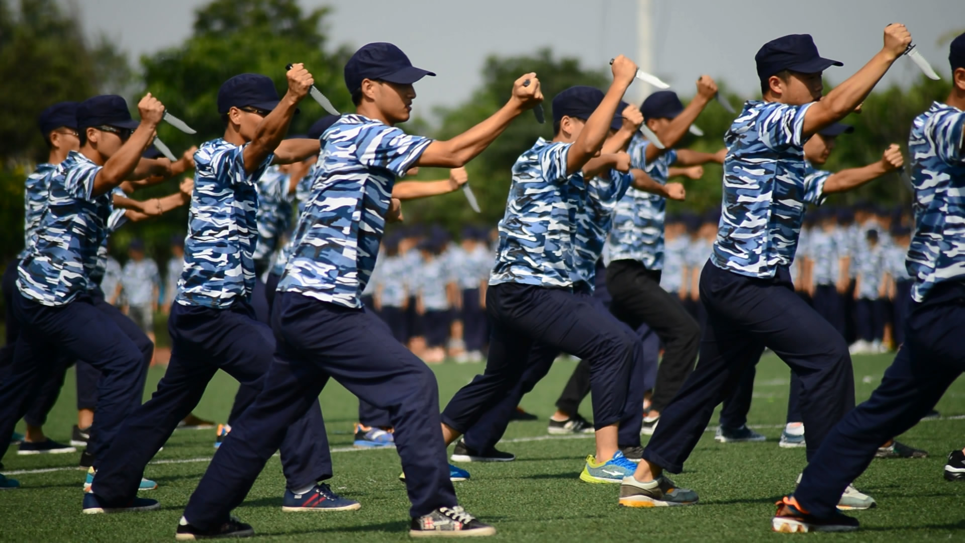 部队教官的严格训练下,短短几天时间,站军姿、走队列、踢正步、敬军礼几个规定训练动作,同学们已初见成效。捕俘刀也是练的有模有样。