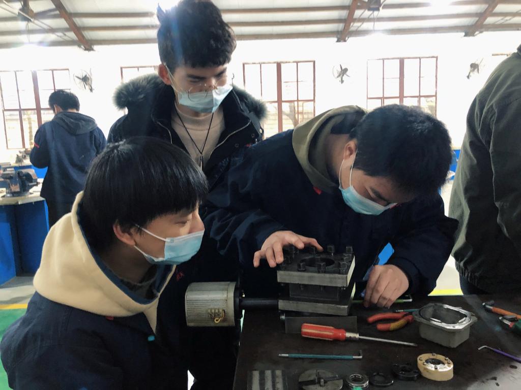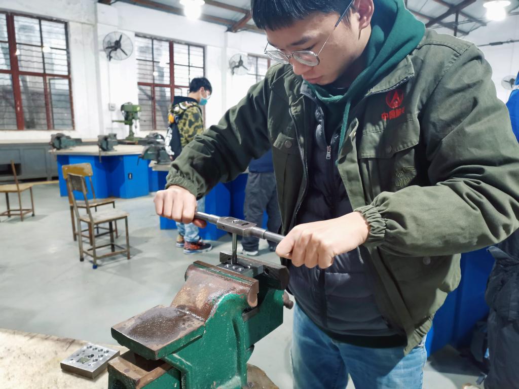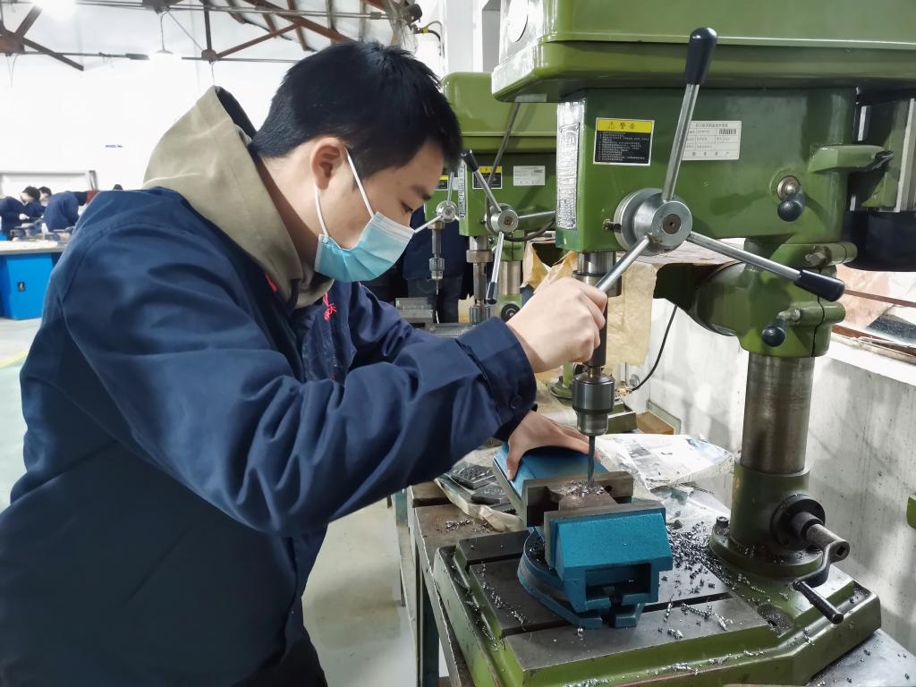 钳工实训指导教师顾启涛根据授课计划,从钳工锉削姿势、平面锉削、锯割等基本功练习,到钻孔、攻螺纹以及摇臂钻、立钻的使用做了系统讲解和亲身示范,最后统一对数控车刀装配、加工中心主轴装配进行了实操训练。
