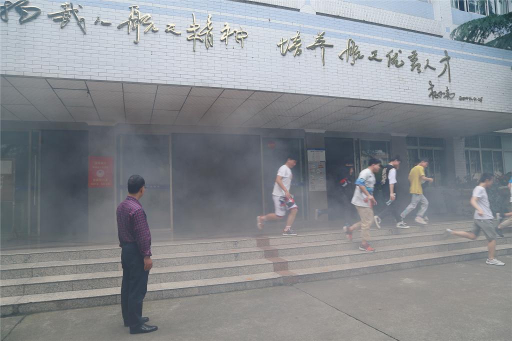 上午11时20分,迎着阵阵浓烟,伴着声声警笛,应急疏散演练正式拉开序幕。参演师生在各楼层疏散引导员的正确指挥下,蒙鼻捂口、弯腰前行,沿着指定逃生路线快速疏散,经过1分45秒,参演师生全部安全疏散至演练集结地,无一人受伤,演练取得圆满成功。