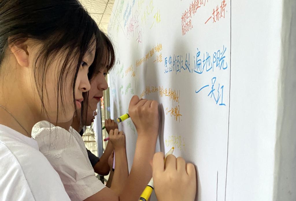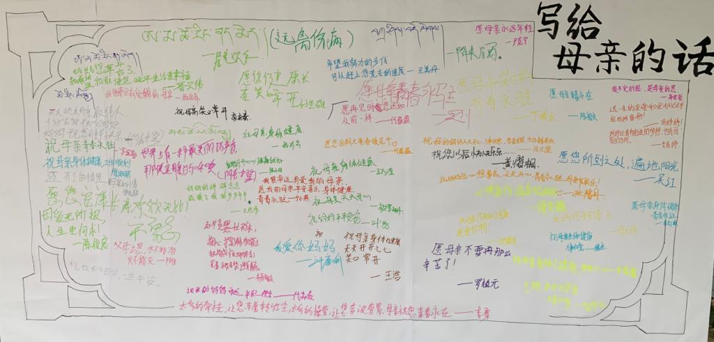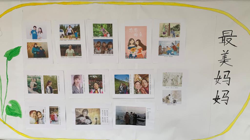 本次活动围绕“大声说爱”、“执笔写爱”、“泼墨祝福”和“追忆年华”四个部分开展。以唱歌、祝福语、诗词朗诵等形式拍摄成视频;通过“我的母亲”为主题的征文,将收录10篇优秀的作品进行张贴展示;设置“妈妈,我想对你说”的展板,让学生现场写下对母亲祝福的话语;收集学生母亲年轻时的照片进行展示,回忆和母亲的点点滴滴。以此触发学生的感恩情怀,向母亲表达自己浓浓的深情,感知母亲的艰辛不易,从而更懂得尊敬母亲、热爱母亲。