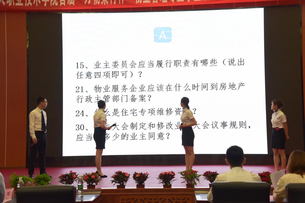 签约仪式之后进行了首届“万物梁行杯”物业管理专业学生技能大赛。大赛分为三个环节:团体形象展示、知识问答、情景模拟。大赛中,参赛选手充分展现自我,发挥潜能,为团队荣誉努力奋战,经过激烈的角逐,评委组评出了一等奖、二等奖、三等奖与优秀奖的团队。最后万物梁行及学院的相关领导共同为获奖的同学颁发了奖金及奖品。