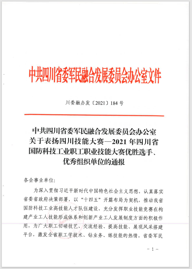 日前,中共四川省委军民融合发展委员会办公室下发川委融办发〔2021〕184号文件“关于表扬四川技能大赛—2021年四川省国防科技工业职工职业技能大赛优胜选手、优秀组织单位的通报”,我校实训教学部教师陈久港、李鲁分别荣获装配钳工第二名和电工第六名。航天工匠班毕业学生马占存、张仕林分别荣获装配钳工赛项第七名和第九名。