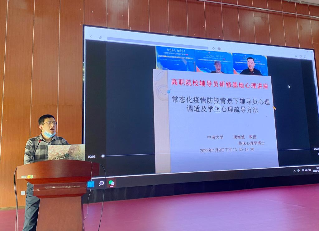 本次培训集中观看了中南大学临床心理学博士唐海波教授主讲的《常态化疫情防控背景下辅导员心理调式及学生心理疏导办法讲座》。讲座围绕什么是焦虑、严重焦虑对人们造成的伤害、焦虑简单自我判断、焦虑的应对办法和焦虑的识别和治疗五个方面做出了专业讲解。