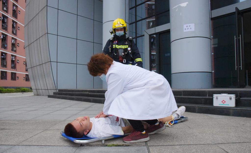 疏散完毕后,广汉市消防中队官兵立即对神舟8号宿舍被困人员展开了应急救援,经过2分钟的搜救,一名“轻伤员”在消防中队官兵担架的救助下顺利脱险,被送到校园医疗救助点,实施了应急救护。