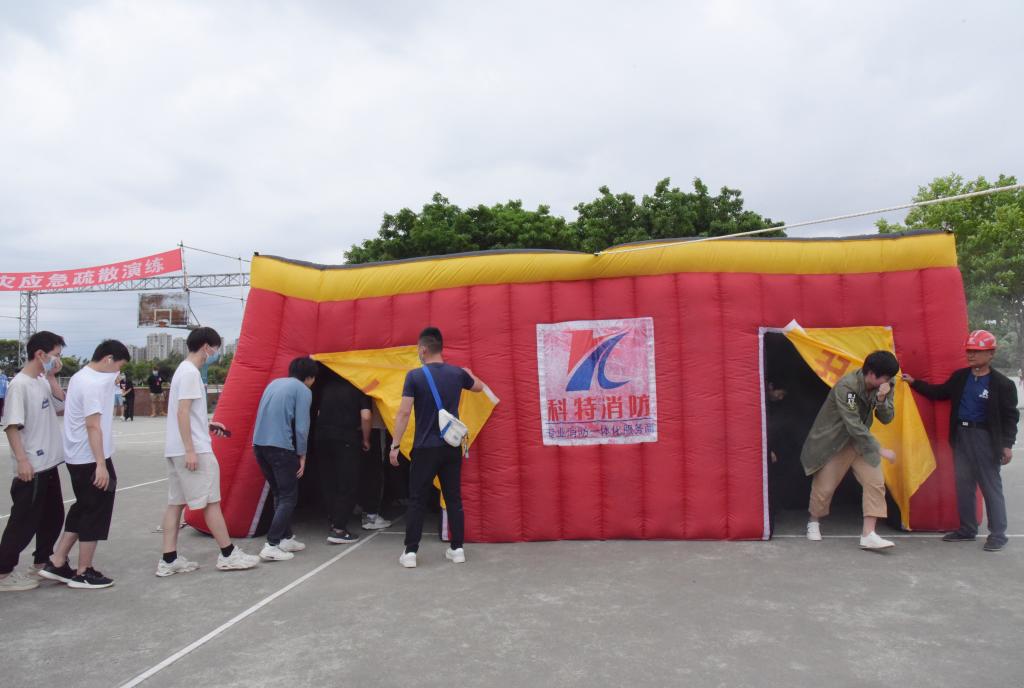 为更加真实的模拟火灾现场逃生的环境,在三星堆校区篮球场,演练指挥部还设置了逃生方舱体验环节,工作人员在模拟着火方舱内部投放了多个发烟装置,并组织演练师生分组通过浓烟密布、漆黑曲折的逃生通道,让大家对火场逃生环境有了一个更加直观真切的感受。