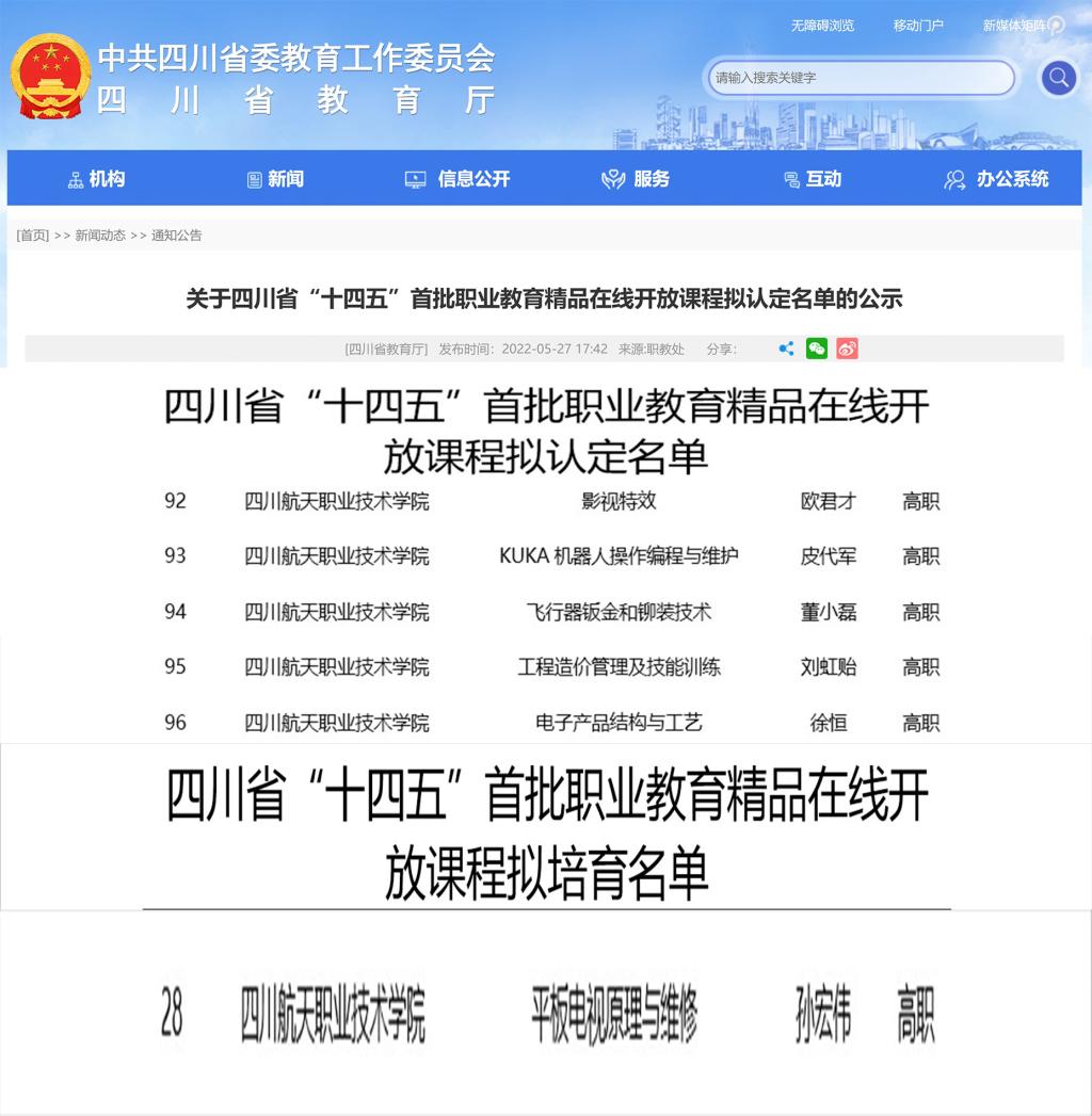 近日,四川省教育厅发布《关于四川省“十四五”首批职业教育精品在线开放课程拟认定名单的公示》,依据公示结果,学院前期依据《四川省教育厅关于做好“十四五”职业教育精品在线开放课程建设工作的通知》推荐申报的6门课程,共获认定5门,培育1门。