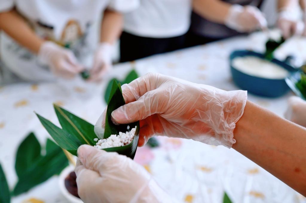 端午节又称端阳节、龙舟节,为每年农历五月初五。端午食粽之风俗,千百年来在中华大地上盛行不衰。活动开始前,张皓南老师首先为大家讲解了端午节吃粽子的来历和习俗。随后,同学们穿戴好帽子、手套于长桌前围成一圈,饶有兴趣开始学习制作粽子的各种技巧。