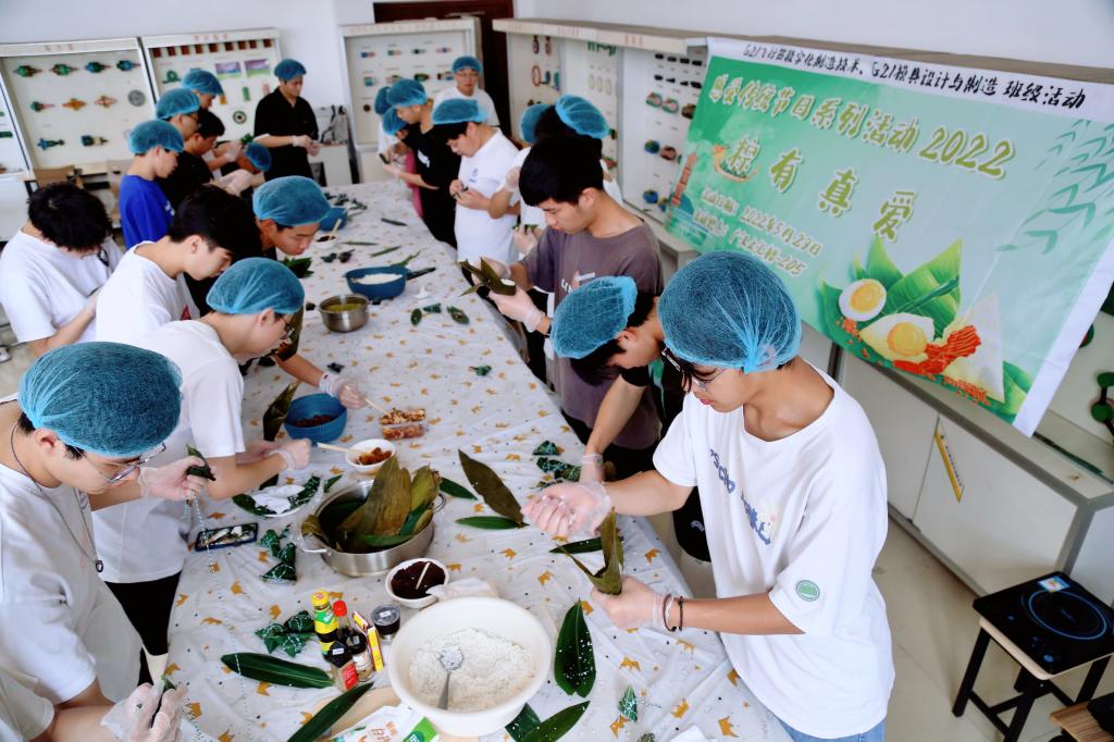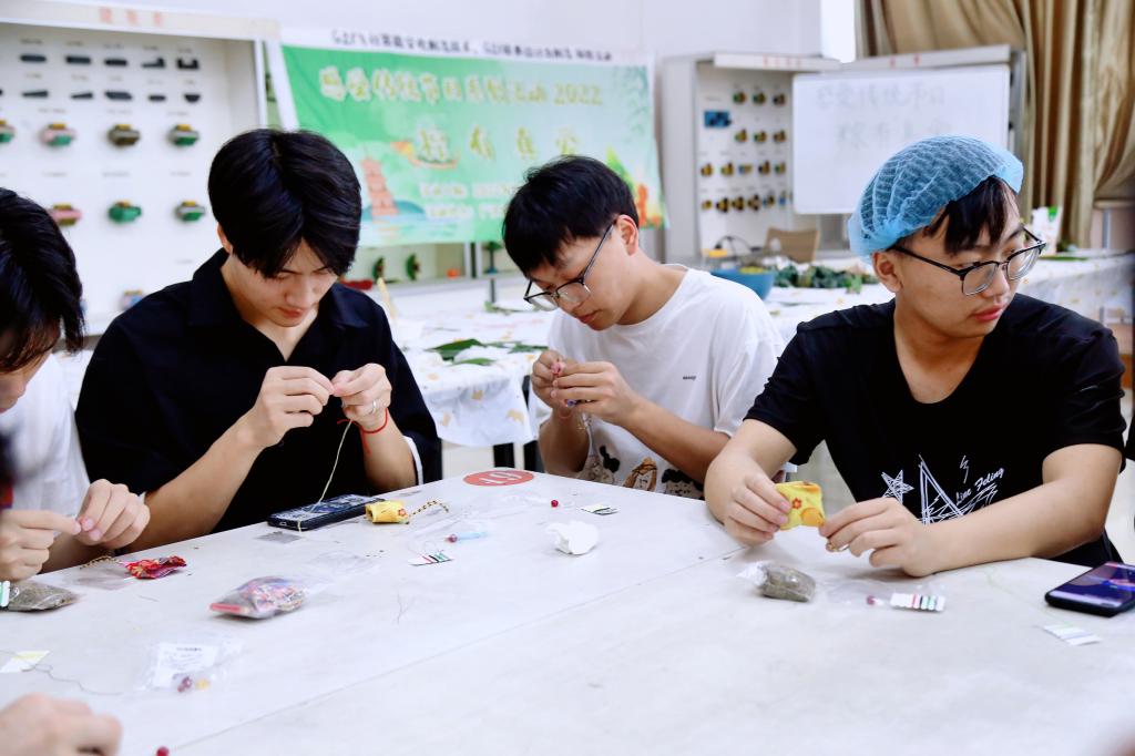 在蒸煮粽子的过程中,同学们还学习制作了承载传统文化特色的艾草香囊。艾草香囊有提神醒脑、避邪、驱寒之功效。经过大家巧手缝制和穿线配珠,散发清新芳香且寓意满满的香囊便制作完成。大家有说有笑,现场气氛温馨而热烈。
