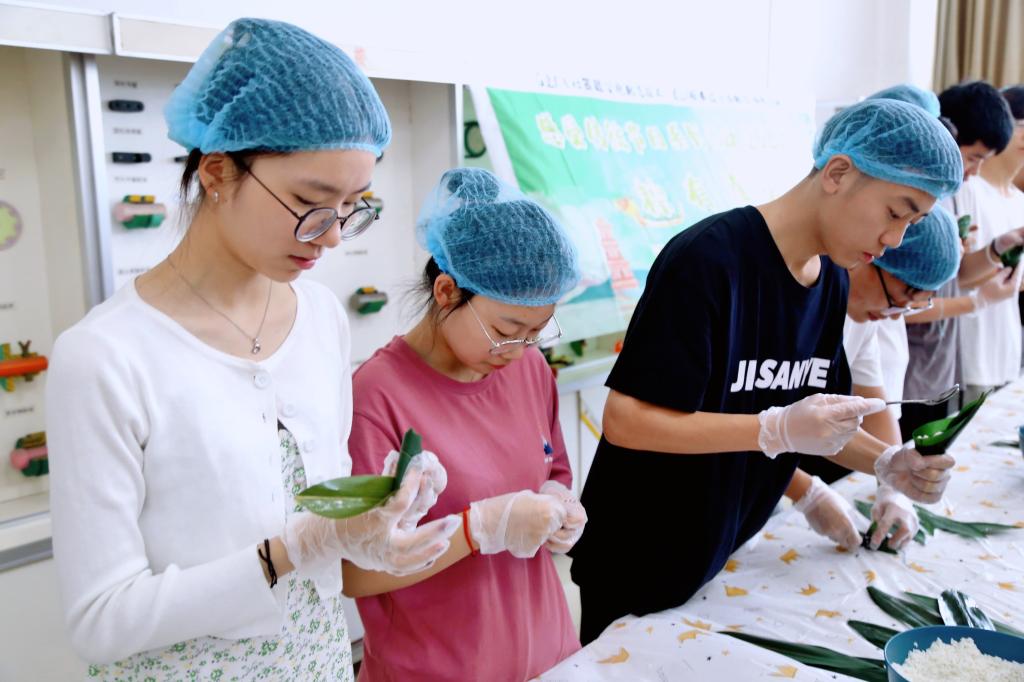 端午节又称端阳节、龙舟节,为每年农历五月初五。端午食粽之风俗,千百年来在中华大地上盛行不衰。活动开始前,张皓南老师首先为大家讲解了端午节吃粽子的来历和习俗。随后,同学们穿戴好帽子、手套于长桌前围成一圈,饶有兴趣开始学习制作粽子的各种技巧。