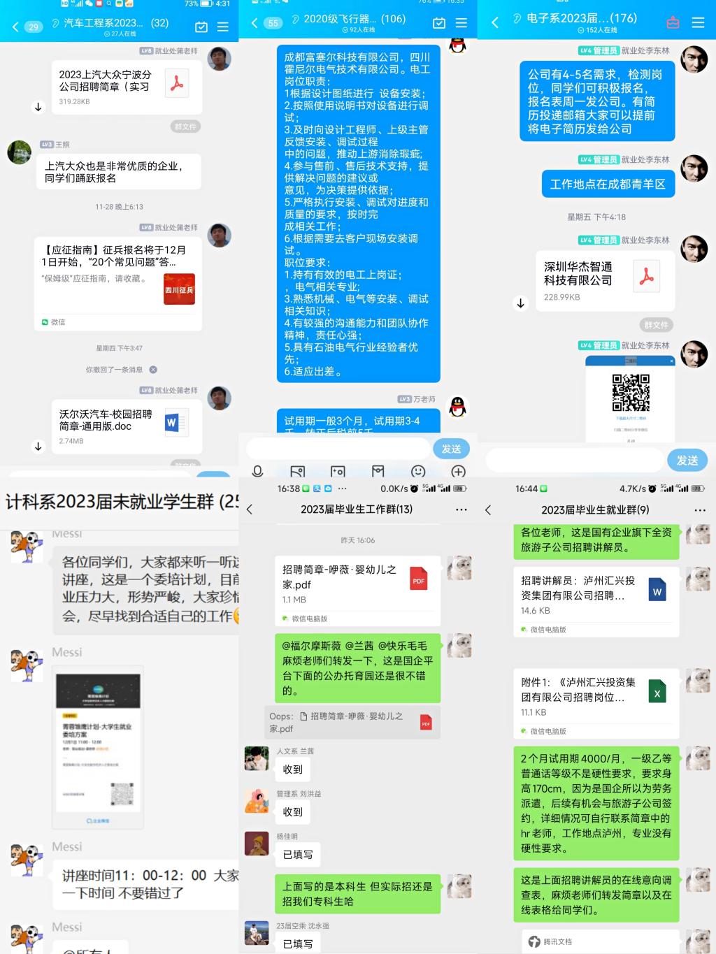 充分利用学院官网平台、就业处微信公众平台、辅导员工作群、学生干部工作群等服务平台及时传递最新就业政策、就业动态、用人单位招聘信息、求职避坑小技巧、面试小技巧、简历制作小技巧等,提高2023届毕业生对当今就业工作的认识,选择优质的企业单位,营造浓厚的就业氛围,提升就业质量。