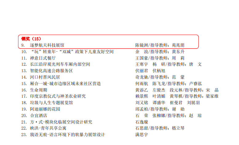 本届中国之星设计奖征集申报有效作品22611件/套(其中专业组8593件/套、学生组14018件/套),这是中国之星设计奖自创办40年来首次实现全国34个省市区全覆盖。由数码艺术学院苑兆朋老师指导的2020级学生陈镜洲设计的作品《逐梦航天科技展馆》,荣获第十六届中国之星设计奖(学生组)希望之星设计奖空间设计类铜奖。