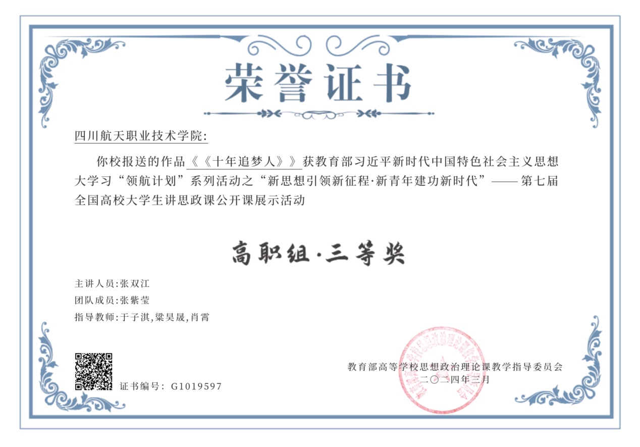 近日,教育部公布了第七届全国高校大学生讲思政课公开课展示活动获奖名单,十大网投平台排名参赛作品《十年追梦人》荣获全国高职组三等奖。该作品由马克思主义学院教师于子淇、梁昊晟、肖霄指导,G22空乘3班张双江同学主讲。
