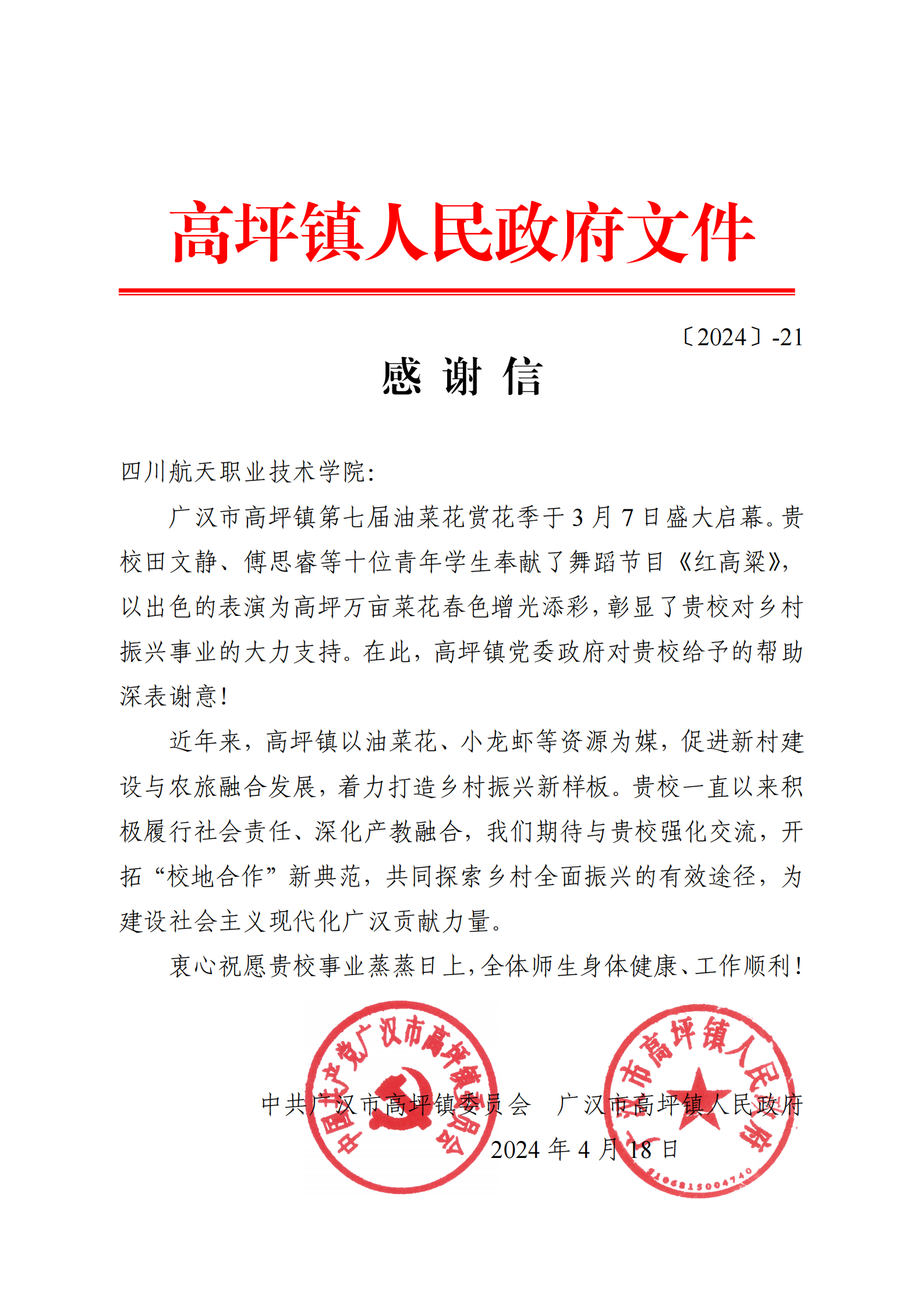 日前,中共广汉市高坪镇委员会、高坪镇人民政府向我校发来感谢信,对我校在第七届油菜花赏花季相关工作中给予的大力支持表示衷心的感谢。