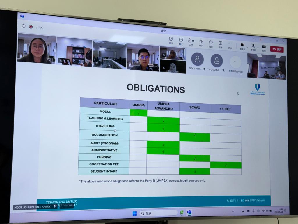 会上,双方明确了两校合作分工内容及建设要点,并就机构专业特色、课程设置、课时分布、引进课程课时及马方承担课程课时比例、派遣教师管理等方面内容进行讨论,对人才培养方案课程体系的整体建设达成共识。会后,双方将梳理会上提及的工作要点,进一步完善中马合作办学专业人才培养方案。