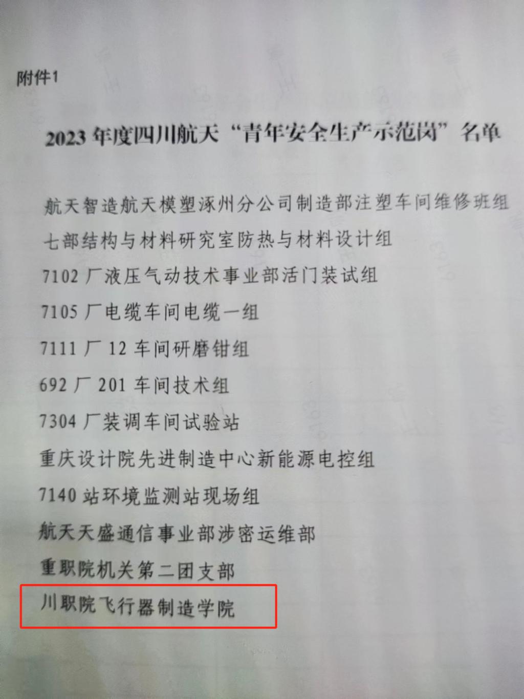 近日,四川航天技术研究院认定12个集体为四川航天“青年安全生产示范岗”,我校飞行器制造学院光荣上榜。