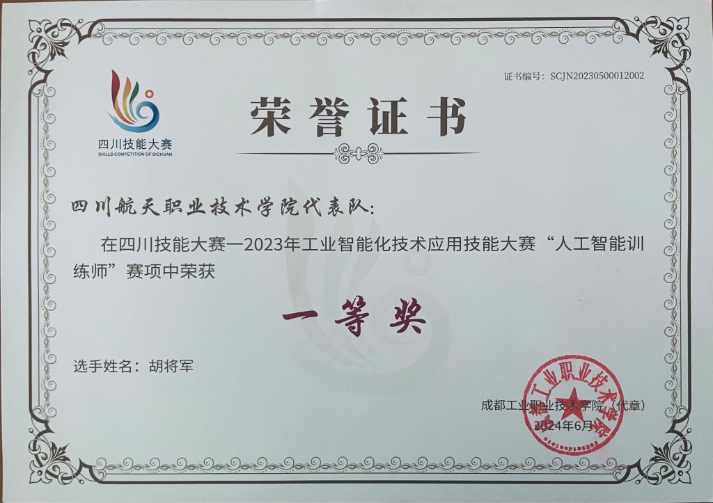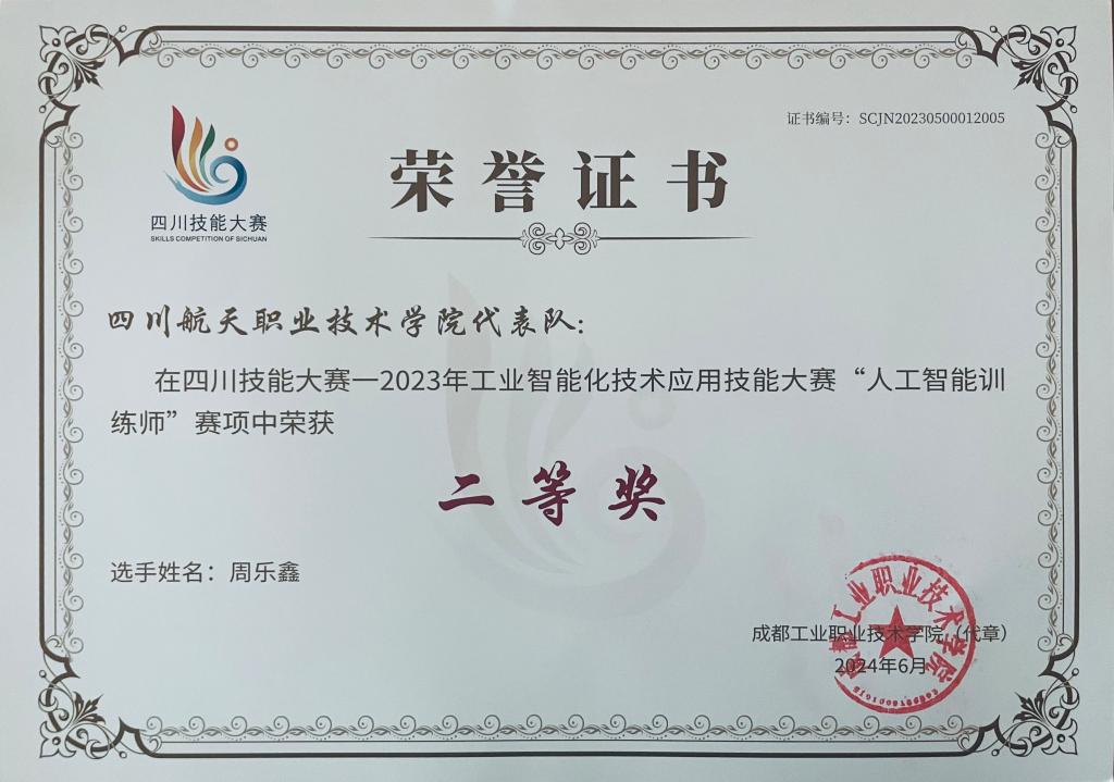 计算机学院3名教师获得四川技能大赛获奖证书。据悉2023年10月20日-21日,四川技能大赛—2023年工业智能化技术应用技能大赛在成都工业职业技术学院举办,计算机学院选派黎洋、周乐鑫和胡将军3位教师参加人工智能训练师赛项(个人赛)。