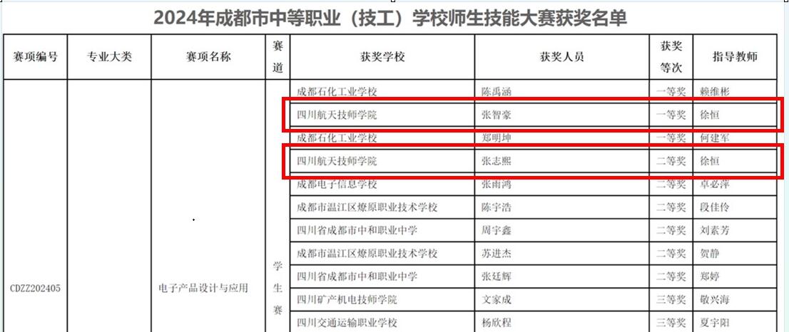 近日,成都市教育局公布了2024年成都市中等职业(技工)学校师生技能大赛获奖名单,我校学生在《电子产品设计与应用》和《电子商务运营》赛项中取得了优异成绩,为学校赢得了荣誉。