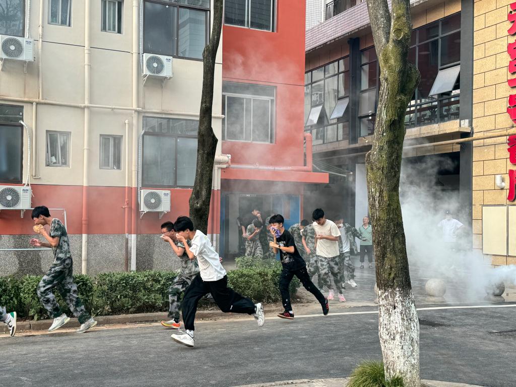 随着警报声的响起,疏散演练正式拉开序幕。各楼层楼道工作人员明确分工,所有学生以班级为单位,按照既定的疏散路线安全有序撤离“事故现场”,同学们捂住口鼻、低头弯腰安全 “逃生”。整个演练过程快速有序,达到了预期的效果。演练结束后,全体师生在教官的组织下进行灭火演练,教官向大家详细讲解了灭火的原理、灭火器的使用方法和注意事项,并手把手教大家操作灭火器,组织进行灭火实操,引导全体师生真正掌握灭火器的正确使用方法。