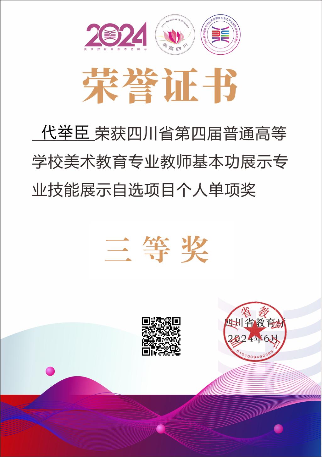 我校人文社科学院美术教师代举臣荣获美术专业技能(自选)个人单项三等奖,充分显示了我校教师扎实的教育功底和美育底蕴。