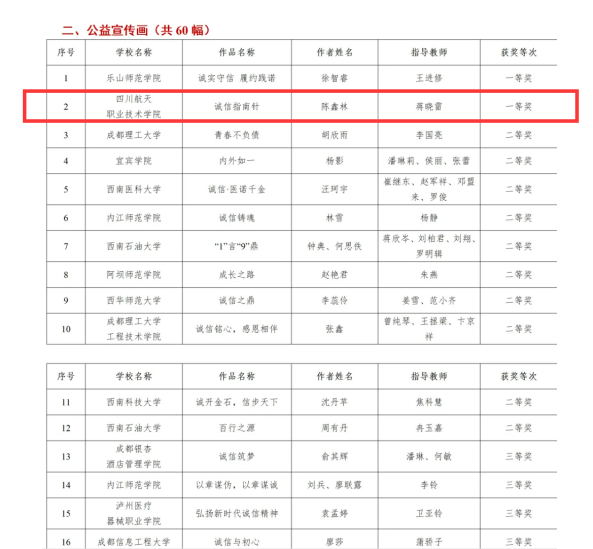近日,由四川省教育厅联合中国人民银行四川省分行开展的2024年全省高校学生资助诚信教育主题活动暨宣传作品征集活动落下帷幕,发布了2024年全省高校学生资助诚信教育宣传作品评选活动的结果。此次征集活动,共收到108所高校作品570件,其中公益短片170部、公益宣传画202幅、现代短诗198首。